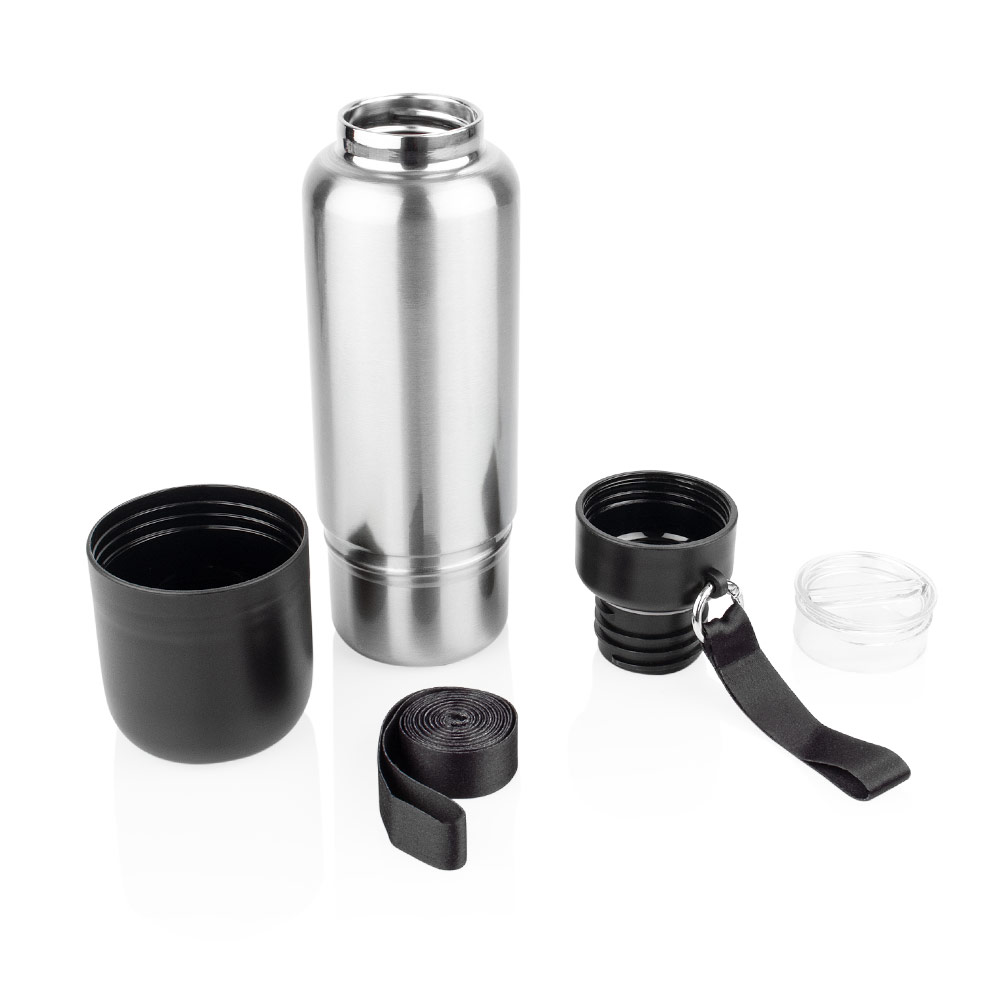 Botella Vacuum. Cuerpo de acero inoxidable de doble pared al vacío. Tapa de plástico con función de almacenamiento y cordón de 2 tamaños. Base de plástico extraíble con función de taza. Capacidad: 500 ml / 17 Oz.