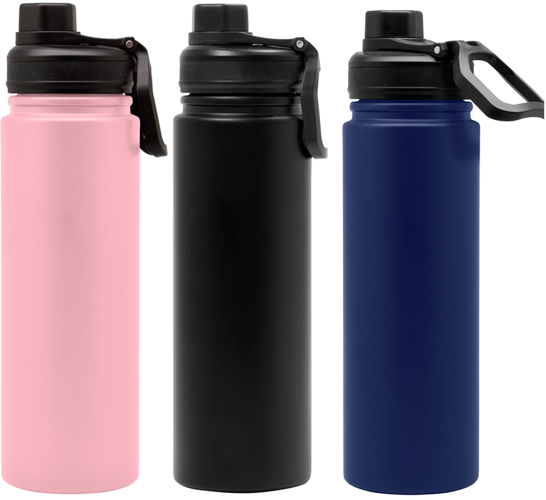 Botella doble pared, sellada al vacío. Interior en acero 304 y exterior en acero 201. Tapa con anillo de silicona, boquilla con cierre a rosca antiderrame y manija plástica para su agarre. Mantiene hasta 12 hs la temperatura de las bebidas calientes y 24 hs de las bebidas frías.