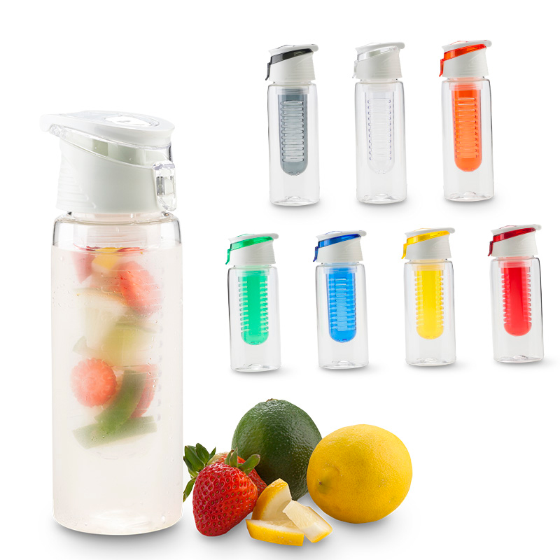Botilito en policarbonato con infusor Tapa pestaña Colores: Amarillo / Azul / Blanco / Naranja / Negro /Rojo / Verde Medidas: 23 cm X 7 cm diámetro área de Marca: 4 cm Técnica Marca: Tampografía