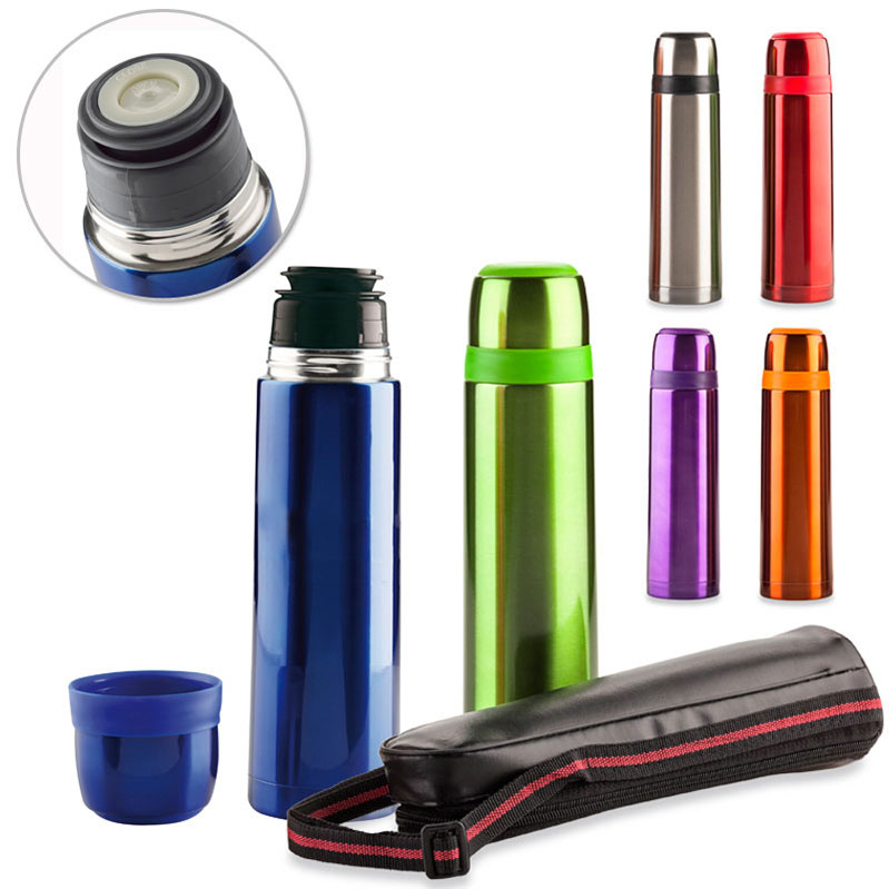 Termo doble pared en acero inoxidable tapa rosca y cierre a presión Con estuche de cuero negro Color: Azul / Morado / Naranja / Rojo / Silver / VerdeMedidas: 25 2 cm alto x 6 8 cm diámetro Técnica de marca: Tampografía área de marca: 4 cm x 4 cm