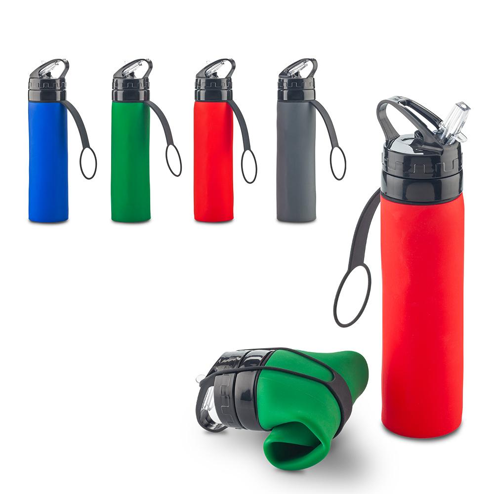 Silicona. Con tapa plástica de rosca, chupo y banda para plegar.