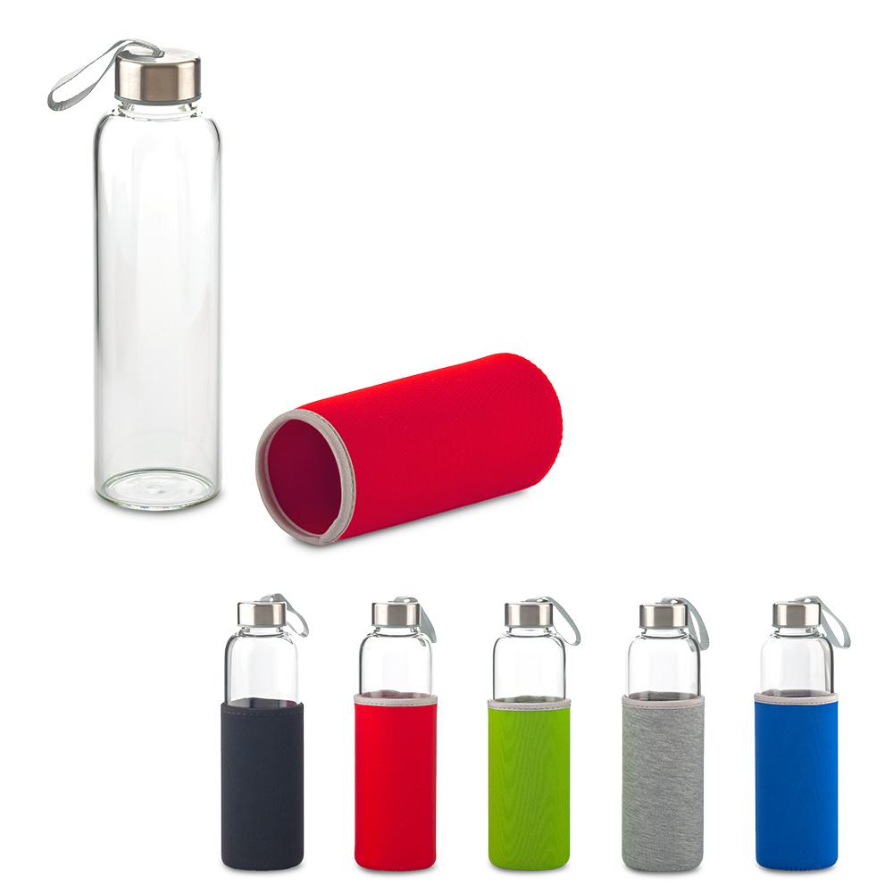 Vidrio. Con tapa interior plástico y exterior metálico, cordón para cargar. Cubierta en neopreno.