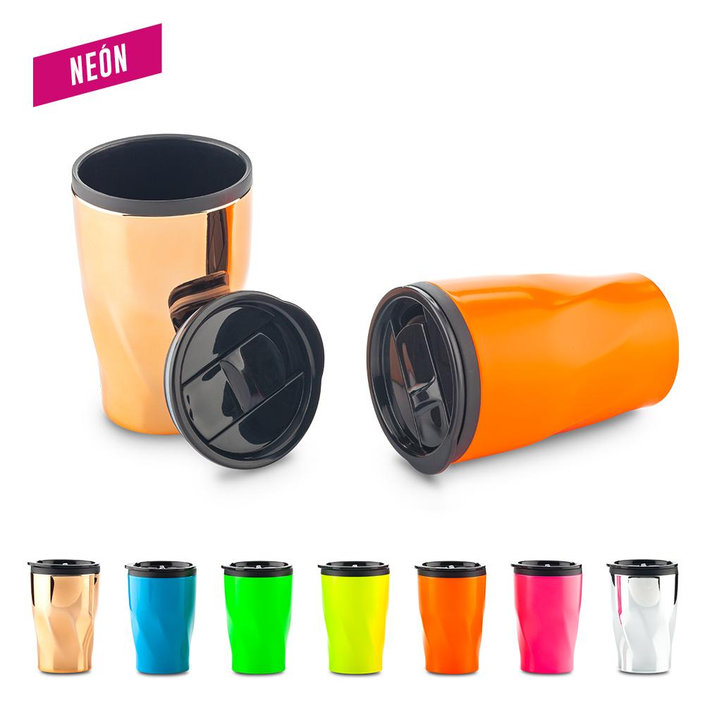 Mug metálico con interior plástico y tapa. La tapa es una tapa protectora, no es tapa de seguridad.