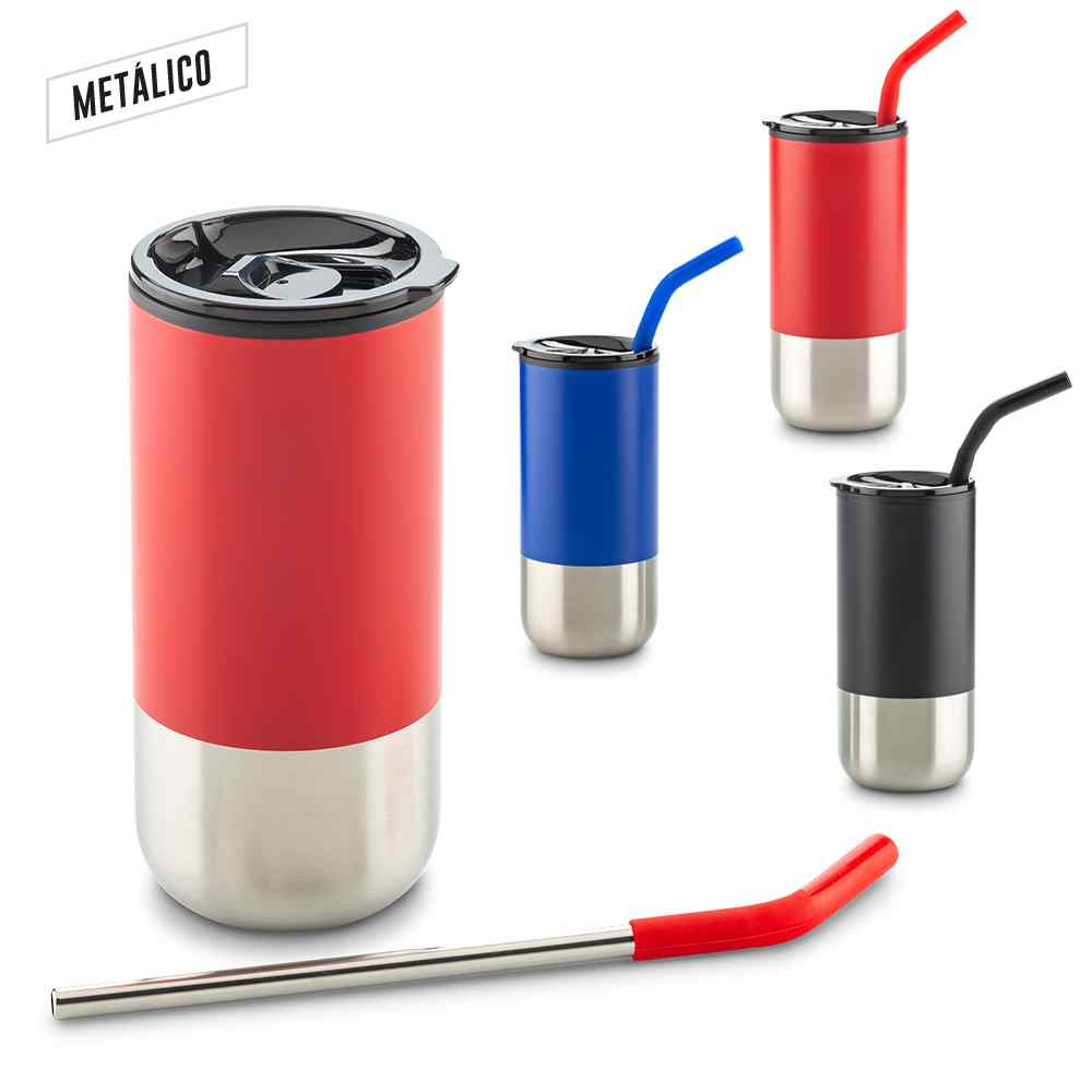 Vaso de interior plastico y exterior en acero inoxidable incluye pitillo metalico con boquilla superior en silicona Empaque caja individual Medidas: 17 5 cm x 7 5 cm diametroMarca: 4 cm / TampografiaFicha Tecnica