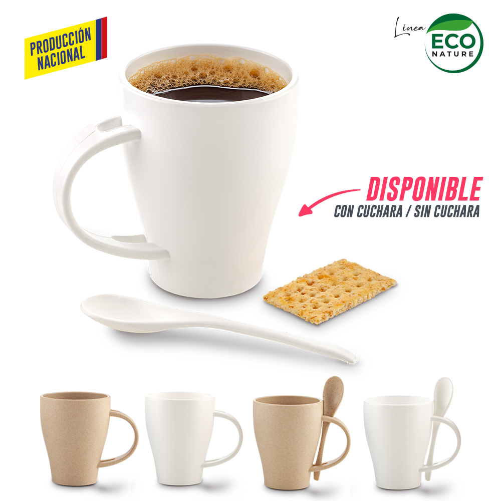 Mug plástico de producción nacional, elaborado en polipropileno. Opcional con o sin cuchara.Color blanco sólido o con material ecológico en fibra de trigo (50% aprox). El porcentaje de material ecológico tiene un promedio de biodegradabilidad de 2-3 años después del fin de su vida útil. Medidas: 10.5 cm x 8.3 cm diámetro . Marca: 4 cm / Tampografía **Para el material con contenido de fibra de trigo puede haber variación en el tono de los colores debido a la reacción del tipo de material y los colorantes usados en la fabricación**