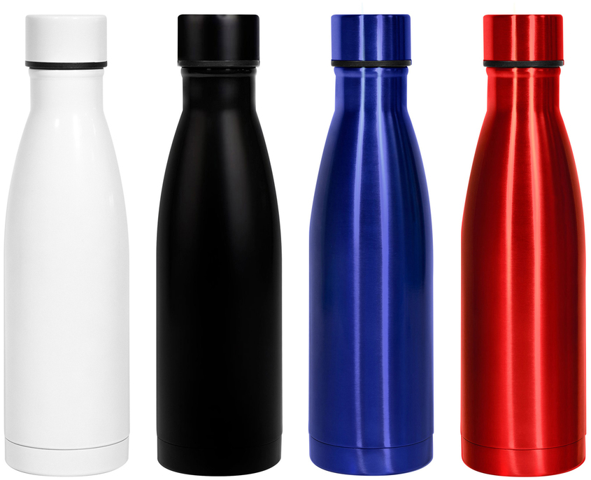 Ø 7 x 25,5 cm. Capacidad 500 ml. Acero inoxidable. Botella con aislamiento térmico vacuum. Interior de acero 304 y exterior de acero 201. Cuerpo y tapa a rosca del mismo color. Mantiene hasta 12 hs la temperatura de las bebidas calientes y 24 hs de las bebidas frías. Presentación en caja de regalo.