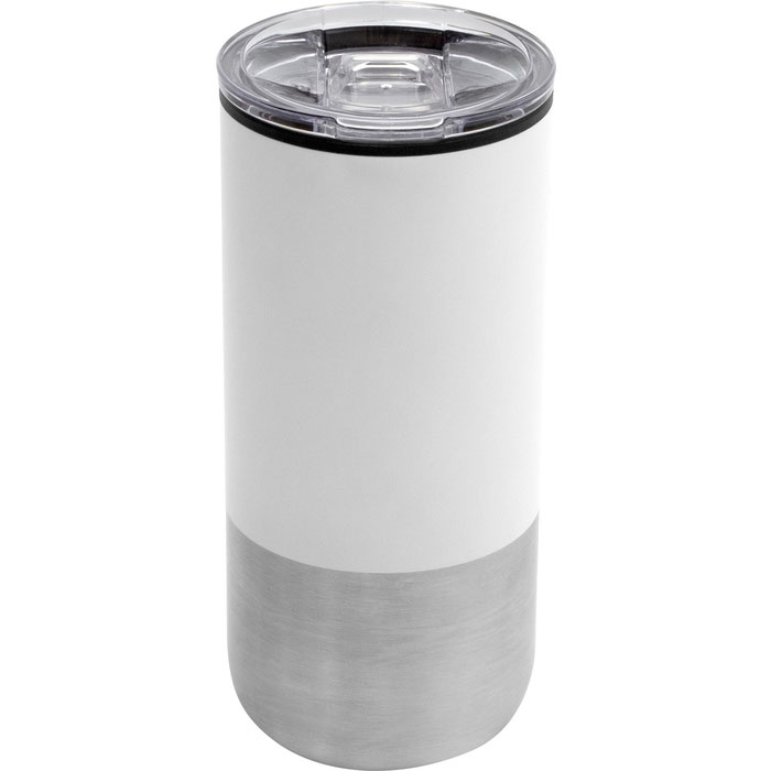 Ø 8 cm X 17.6 cm. Capacidad 500 ml. Polipropileno y acero inoxidable. Mug doble pared. Interior en plástico y exterior de acero inoxidable 201. Tapa transparente a presión con boquilla y seguro antigoteo. Base antideslizante. Presentación en caja de regalo.