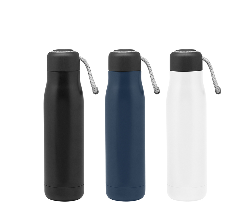 Botella doble pared, sellada al vacío con aislamiento térmico vacuum. Interior de acero 304 y exterior de acero 201. Tapa plástica de polipropileno y anillo de silicona. Posee además tira de color gris de 12 cm de largo. Ideal para llevarla a todos lados. Mantiene hasta 12 hs la temperatura de las bebidas calientes y 24 hs de las bebidas frías.