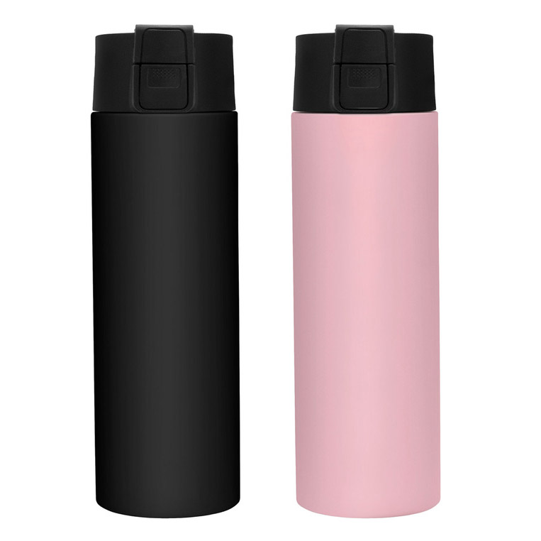 Ø 7 cm x 23 cm. Acero inoxidable. Capacidad 450 ml. Botella con aislamiento térmico vacuum. Interior de acero 304 y exterior de acero 201. Pintura acabado mate. Tapa en PP con traba de seguridad y botón pulsador de apertura. Mantiene por más de 12 hs la temperatura de las bebidas calientes y 24 hs de las bebidas frías. Presentación en caja de regalo kraft.