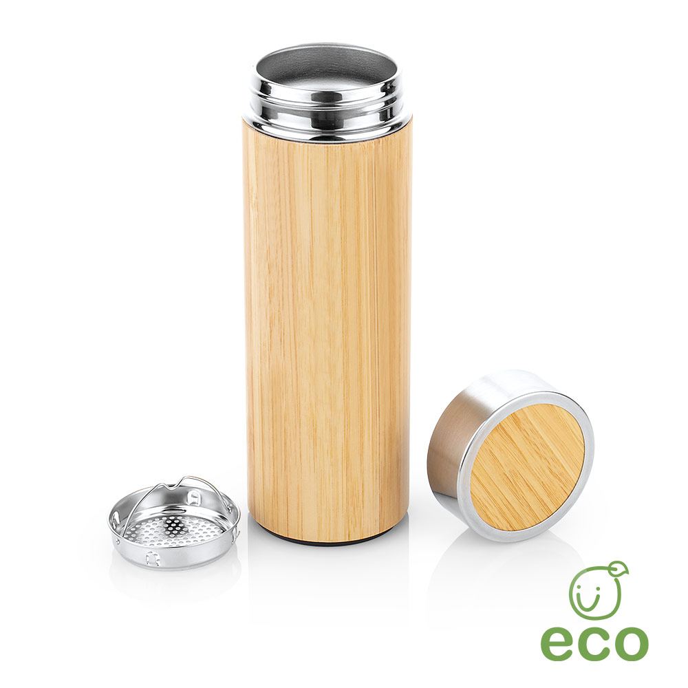 Termo con estructura de doble pared en acero inoxidable, diseñado para conservar la temperatura de las bebidas. Su pared externa está recubierta en bambú natural, lo que le aporta un acabado elegante y ecológico. Incluye infusor con filtro para preparar bebidas directamente en el termo, y una tapa con cierre giratorio también recubierta en bambú. Ideal para bebidas calientes o frías en cualquier entorno. Capacidad: 550 ml / 18 Oz.